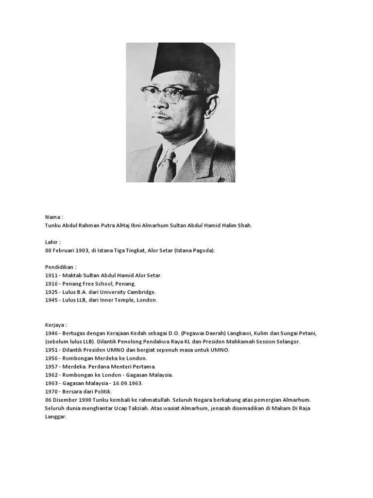 Was a malaysian statesman who served as the head of. Latar Belakang Tunku Abdul Rahman Almarhum Tunku Abdul Rahman Putra Al-Haj ibni Almarhum Sultan Abdul Hamid Shah 1903-1990 merupakan Ketua Menteri Persekutuan Tanah Melayu dari 1955 dan menjadi Perdana Menteri Malaysia yang. Tunku Abdul Rahman Putra Al-Haj ibni Almarhum Sultan Abdul Hamid Halim Shah Jawi.