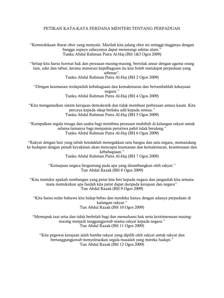 Bincangkan 4 sumbangan Tunku Abdul Rahman Putra Al-Haj sebagai Perdana Menteri Pertama Malaysia. Let us always remember that unity is our fundamental strength as a people and as nation - Tunku Abdul Rahman - Berkumpul bersama adalah SUKAN DAN PERPADUAN permulaanBersatu adalah kemajuaanBekerjasama adalah kejayaan-Henry Ford ISI KANDUNGAN PENGENALAN. Mereka akan dapat mengenali tokoh pemimpin negara yang berlainan bangsa dan agama.